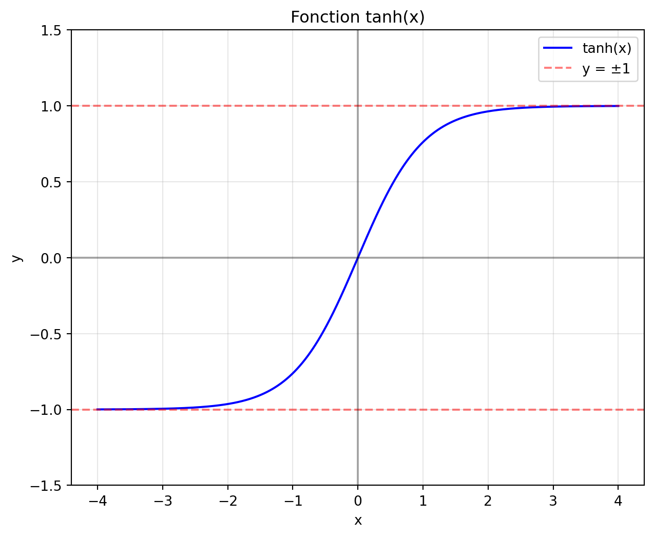 import numpy as npimport matplotlib.pyplot as plt# Création des donnéesx = np.linspace(-4, 4, 1000) # Intervalle de -4 à 4y = np.tanh(x)# Création de la figureplt.figure(figsize=(7.5, 6))# Tracé de la fonctionplt.plot(x, y, 'b-', label='tanh(x)')# Ajout des asymptotes horizontalesplt.axhline(y=1, color='r', linestyle='--', alpha=0.5, label='y = ±1')plt.axhline(y=-1, color='r', linestyle='--', alpha=0.5)# Ajout des axesplt.axhline(y=0, color='k', linestyle='-', alpha=0.3)plt.axvline(x=0, color='k', linestyle='-', alpha=0.3)# Configuration du graphiqueplt.grid(True, alpha=0.3)plt.title('Fonction tanh(x)')plt.xlabel('x')plt.ylabel('y')plt.legend()# Ajustement des limitesplt.ylim(-1.5, 1.5)plt.show()