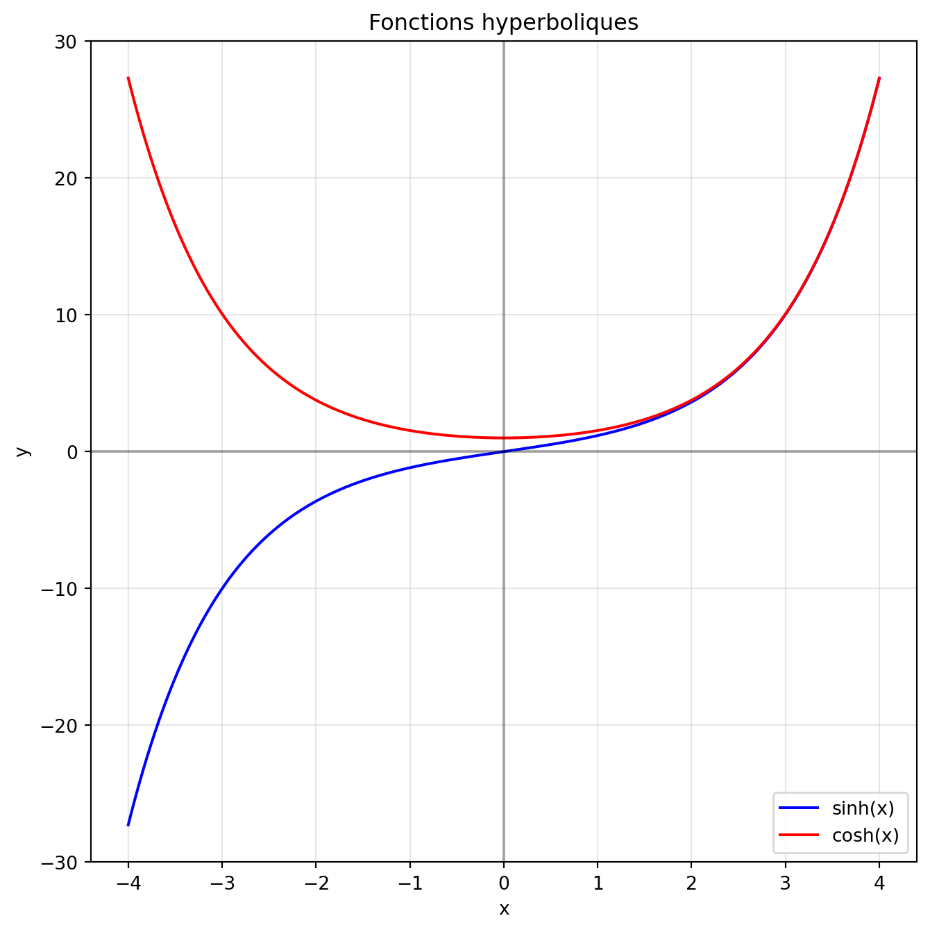 import numpy as npimport matplotlib.pyplot as plt# Création des donnéesx = np.linspace(-4, 4, 1000)sinh = np.sinh(x)cosh = np.cosh(x)# Création du graphiqueplt.figure(figsize=(8, 8))plt.plot(x, sinh, 'b-', label='sinh(x)')plt.plot(x, cosh, 'r-', label='cosh(x)')# Configuration du graphiqueplt.grid(True, alpha=0.3)plt.title('Fonctions hyperboliques')plt.xlabel('x')plt.ylabel('y')plt.legend()plt.axhline(y=0, color='k', linestyle='-', alpha=0.3)plt.axvline(x=0, color='k', linestyle='-', alpha=0.3)plt.show()