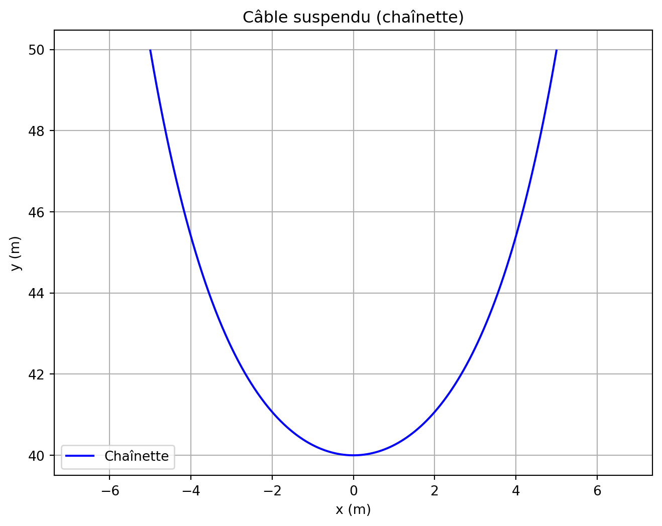 import numpy as npimport matplotlib.pyplot as plt# Paramètresa =2.03k =37.97# Pointsx = np.linspace(-5, 5, 1000)y = a * np.cosh(x/a) + k# Graphiqueplt.figure(figsize=(8, 6))plt.plot(x, y, 'b-', label='Chaînette')plt.grid(True)plt.axis('equal')plt.title('Câble suspendu (chaînette)')plt.xlabel('x (m)')plt.ylabel('y (m)')plt.legend()plt.show()